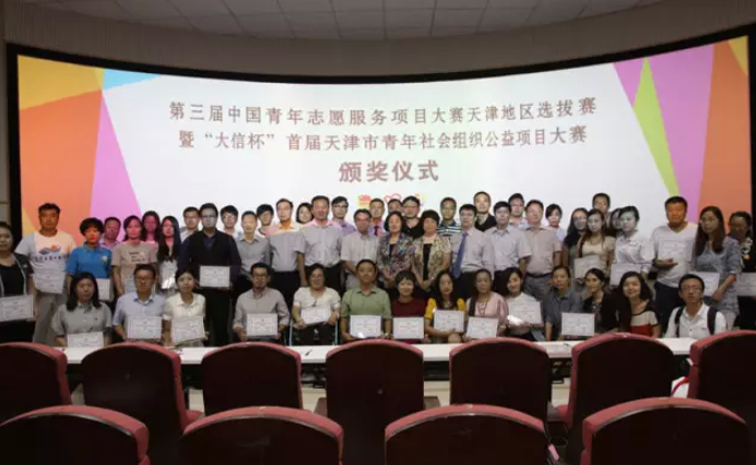 今天,由团市委联合市文明办、市民政局、市水务局、市残联共同主办的第三届中国青年志愿服务项目大赛天津地区选拔赛暨“大信杯”首届天津市青年社会组织公益项目大赛圆满落下帷幕。团中央志工部部长张朝晖、市文明办副主任赵华、市民政局副局长张清玲、市水务局副局长张志颇、团市委副书记王凤等领导同志出席了活动。全市部分单位的团委负责同志、青年志愿者组织和青年社会组织代表、获奖项目代表参加了活动。