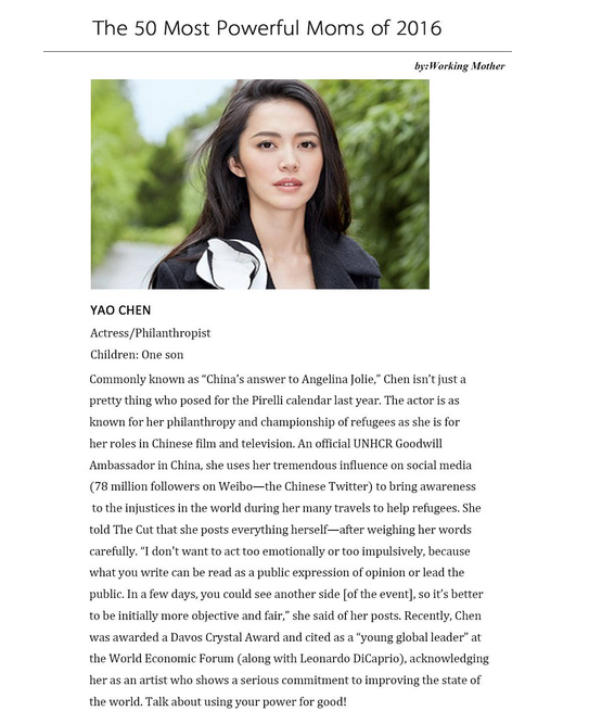 近日,美国Working Mother网站发布了“2016年全球最具影响力的50位母亲”名单,中国女演员姚晨与奥斯卡影后凯特·布兰切特、英国流行歌手阿黛尔·阿德金斯等50 位女性共同入选。网站报道中如是评价:作为一名常年活跃在荧幕上的女演员,姚晨对公益事业的支持,让她得到了更多瞩目。