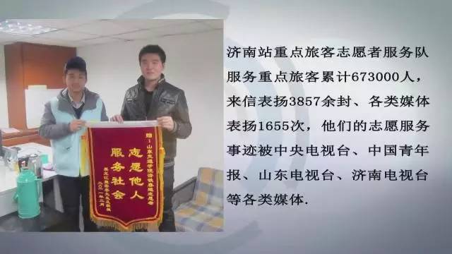 济南站重点旅客志愿者服务队服务重点旅客累计673000人,来信表扬3857余封、各类媒体表扬1655次,他们的志愿服务事迹被中国青年报、济南电视台、济南时报、齐鲁晚报等各类媒体多次报道。