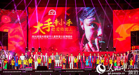 人民网广州9月20日电(记者李刚)“大手牵小手把爱传出去”阳光雨露关爱留守儿童群星公益演唱会近日在广州国际体育演艺中心举行,包括知名明星歌手、主持人、政府和社会各界人士等1.2万人参加晚会,共襄善举帮扶留守儿童。