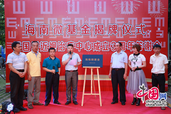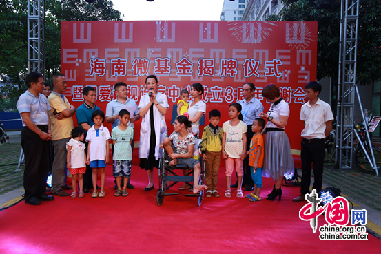 在微基金揭牌现场,国爱近视治疗中心顾国贞院长,将准备用于院庆的10万元人民币,捐赠给微基金。由微基金共同监管,用于海口市龙泉镇“8岁爸爸”蔡於川一家的基本生活开支。去年底,蔡於川父亲因病去世,留下瘫痪在床的母亲和分别6岁、3岁的妹妹。顾国贞通过媒体得知蔡於川一家情况后,专程到龙泉登门“认亲”,收养3兄妹,并直至将他们抚养成人。