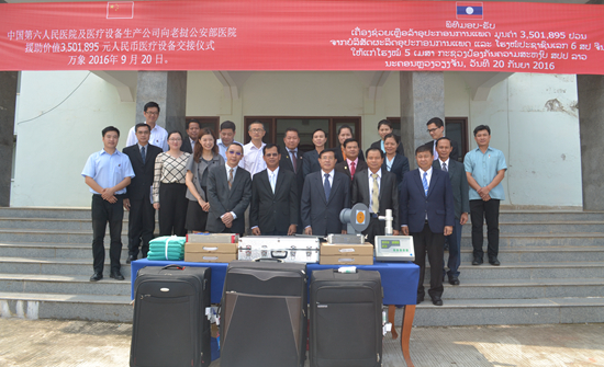 第八批中国(上海)青年志愿者赴老挝服务队与来自中国的4家医疗器械公司在老挝首都万象向老挝武警总医院捐赠医疗器械。中国驻老挝大使馆领导,老挝公安部领导、志愿者以及爱心企业代表合影。