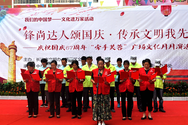 为庆祝中华人民共和国成立67周年,以锋尚达人志愿服务精神推动中华传统文化发展,9月28日上午,“锋尚达人颂国庆 传承文明我先行”暨庆祝国庆67周年“牵手芙蓉”广场文化月月演活动在芙蓉区火星街道举办,通过锋尚志愿者演绎经典曲艺节目、脍炙人口的歌曲作品,传承、发扬中华传统文化底蕴与民族精神。