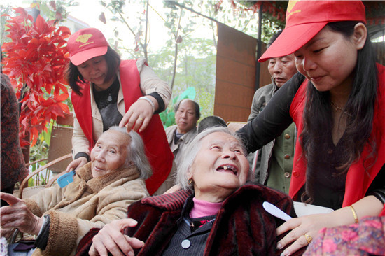 10月8日,江西省遂川县微公益志愿者与老人拉起家常。重阳节前夕,江西省遂川县微公益志愿者开展尊老敬老服务活动,送上义务巡诊、免费理发、文艺演出、与老人拉家常等系列活动。这些志愿者被老人们亲热地称为“儿子”“闺女”。