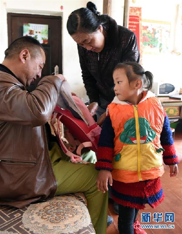 父母帮助其美拉姆整理书包,准备去幼儿园(10月6日摄)。