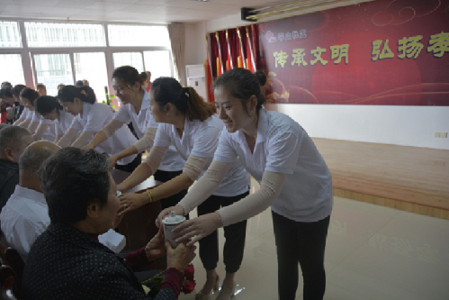 活动中不仅有老年朋友的“婚纱秀”,更有感人至深的18位“社区闺女”端起菊花新茶,依次向百位老人敬茶,传承孝道。这18名工作人员已成为社区老人的贴心“闺女”,老人家里的卫生有“社区闺女”打扫,老人散步有“社区闺女”陪伴,老人高龄补贴有“社区闺女”代办,一件件小事实事温暖着社区老人们的心。同时,向阳养老院还专门为8位老人办起“生日par-ty”,祝老人们晚年幸福。