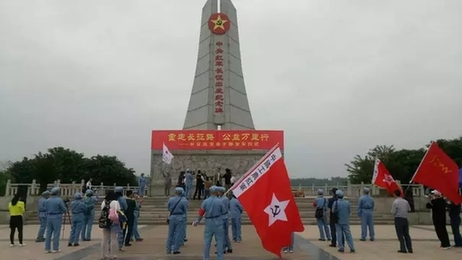于都县中央红军长征出发纪念园活动仪式现场,人潮拥动,红旗飘飘,一面面中国工农红军军旗和印着“长征永远在路上——纪念中国工农红军长征胜利80周年”的彩旗,一部部张贴着“弘扬长征精神传承红色记忆”“长征永远在路上”等字样的出征车辆一字排开,80余名身着红军服装的参加活动人员在纪念园广场上整齐列队,饱含深情地唱响了长征歌曲《七律长征》,并参观了长征出发地纪念馆。