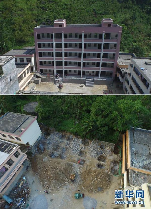 拼版照片:上图为2016年9月5日拍摄的新教学楼;下图为2015年6月30日拍摄的刚刚开工建设的新教学楼工地。