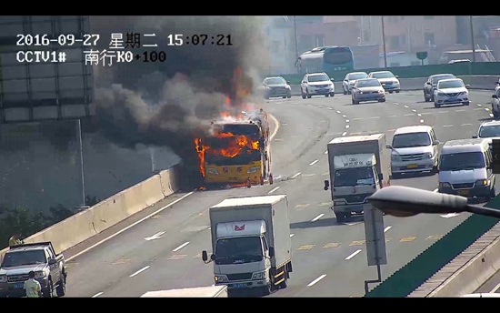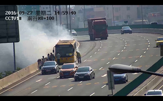 罗、殷二人循声望去,只见前方一台黄色校车停靠在高速公路最右侧车道,火苗不时从车底和轮胎处蹿出,浓烟随风四散,校车司机正在迎着车流灭火。