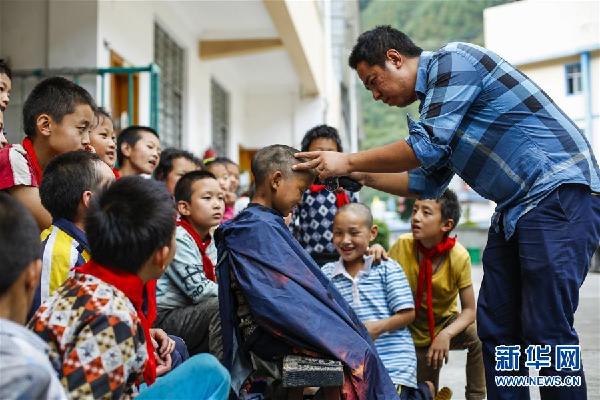 在云南省怒江傈僳族自治州贡山独龙族怒族自治县捧当乡捧当中心校,桑磊(右一)在给班上的男生理发(9月27日摄)。学校所在的村子没有理发店,桑磊就自己花钱买剃头推子,每月义务给全班孩子理发。新华社记者 沈伯韩 摄