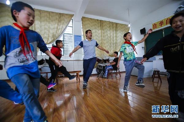 大山深处的老师在云南省怒江傈僳族自治州贡山独龙族怒族自治县捧当乡捧当中心校,桑磊(右三)在活动课上与孩子们练习藏族歌舞(9月25日摄)。新华社记者沈伯韩 摄