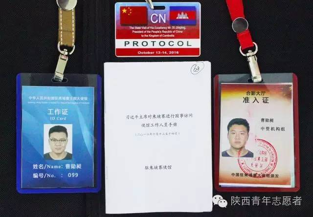 首批援柬埔寨项目志愿者服务队5名志愿者均参与此次高访接待工作和曹勋昶的工作证