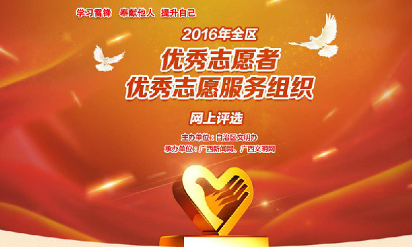 广西新闻网南宁10月25日讯(记者林风眠)为大力培育和践行社会主义核心价值观,弘扬奉献、友爱、互助、进步的志愿精神,营造向上向善、诚信互助的社会风尚,10月25日,由自治区文明办主办,广西新闻网、广西文明网承办的2016年全区优秀志愿者和优秀志愿服务组织评选活动网络投票正式开始!