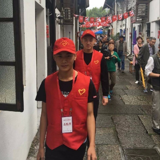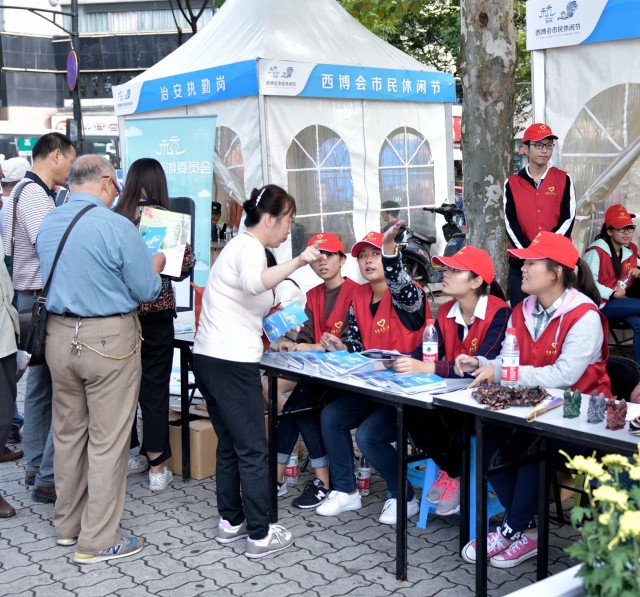 西博会市民休闲节也处处活跃着身穿红色小马甲的杭州志愿者身影。