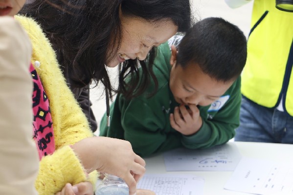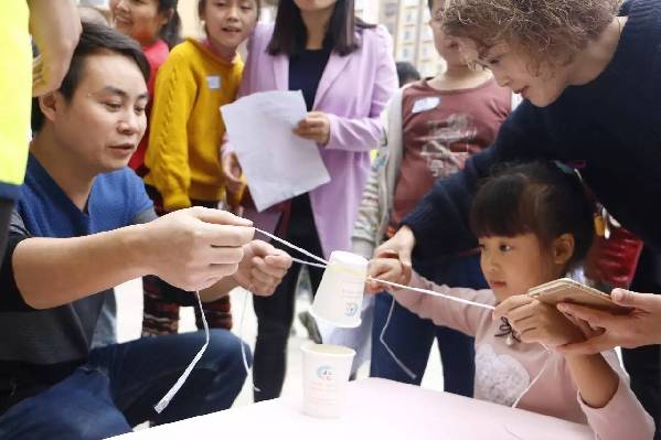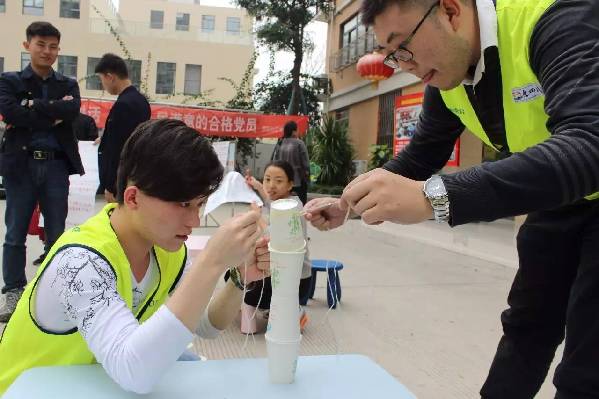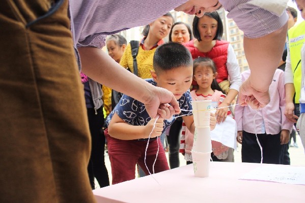 在志愿者的协助下,小朋友一起屏住呼吸成功,完成了纸杯塔的搭建!
