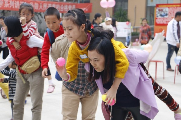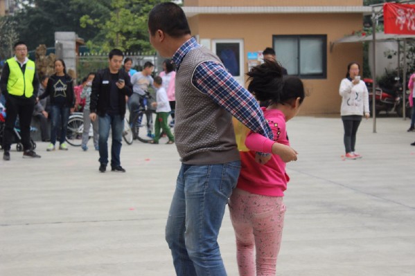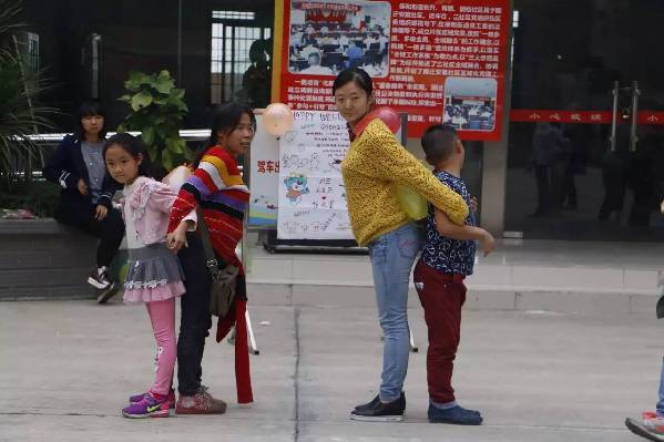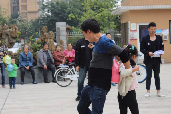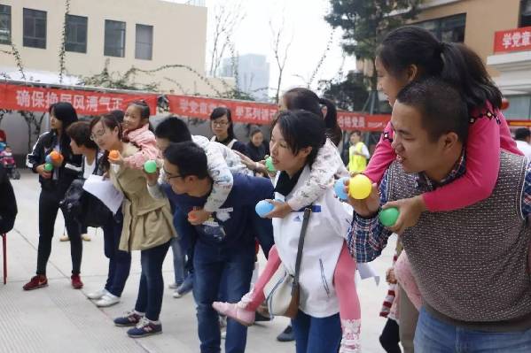 一个家庭为一组,家长与小朋友背对背夹住气球从起点跑到终点,到达终点以后,将用背部把气球弄破!3