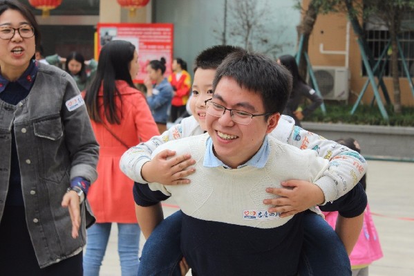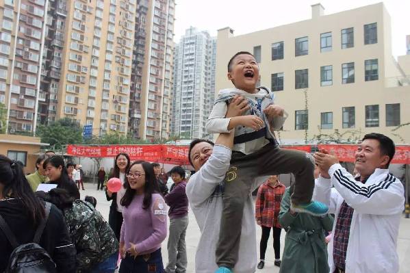 蓄势待发!我们的参赛家庭,向终点奋力的跑去!比赛结束,我们的志愿者背起依旧兴致勃勃的孩子一起玩耍!4