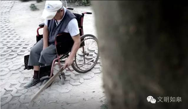 6年来,这位行动不便的老人,每天坐在轮椅车上,用左手挥动着特制的木头“扫帚”,将树叶从地砖的夹缝中一片一片地挑出。老人说:“环境好了,大家心里都舒坦。”