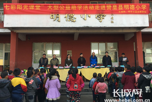 长城网11月28日讯(记者 孙向向 胥文燕刘澜澜)11月28日,由长城网、石家庄市委宣传部共同主办的七彩阳光课堂大型公益助学活动走进赞皇明德小学启动暨捐赠仪式在明德小学举行。长城网、赞皇县委宣传部、赞皇教育局、河北公益志愿团队等单位组织的相关领导和负责人出席并参加了活动。