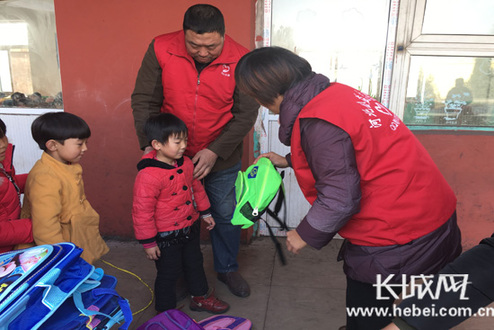 明德小学学生领取捐赠物资。长城网 刘澜澜 摄