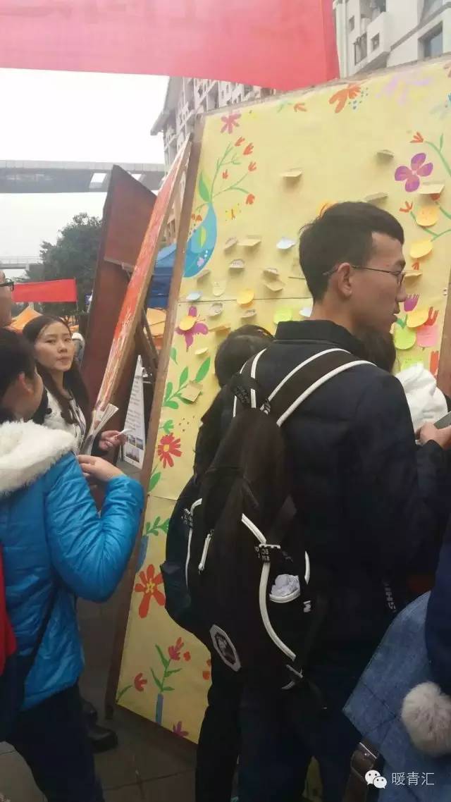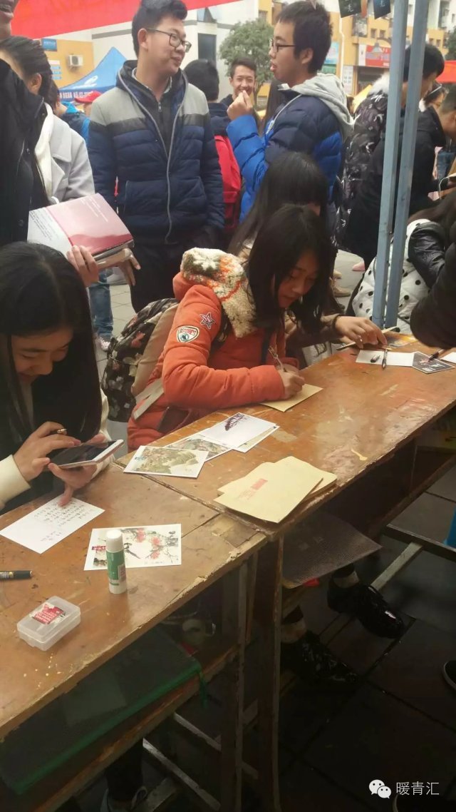 图:重庆理工大学药学与生物工程学院青年志愿者协会在校内一食堂广场进行给老人的一封信活动。