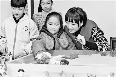 12月7日,在浙江省杭州市萧山区的小学课堂里,杭州萧山“钱塘潮”志愿者服务队通过玩偶实验及箱庭疗法与孩子们进行心灵按摩互动。