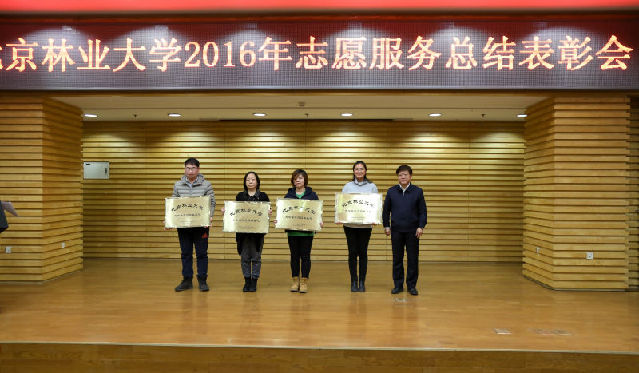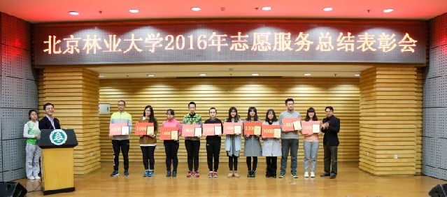 与会领导为获得北京林业大学2016年十大优秀志愿服务项目和十大优秀志愿者颁发证书和奖金。关爱农民工子女志愿服务团、彩虹宝贝志愿服务团、研究生支教团代表进行了分享交流,志愿服务基地代表、优秀志愿者代表进行了精彩发言。志愿者表演了《志在,愿行》主题朗诵。