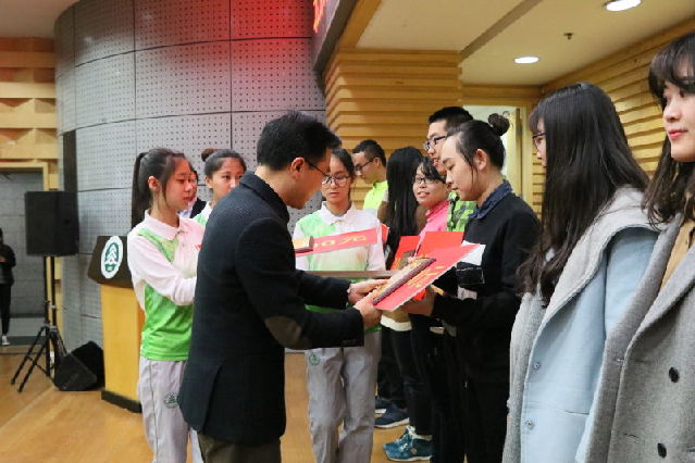 王洪元书记为志愿服务基地授牌并讲话。他首先深刻阐述了志愿服务工作对于高校育人工作的重要作用。他指出,要进一步挖掘志愿文化的内涵、完善青年学生参与志愿服务的平台和渠道,凸显志愿服务对于青年学生的教育意义。要让志愿服务覆盖更多的青年学生,让参与志愿服务成为青年学生的价值追求和生活方式,引导青年学生为推动社会发展进步贡献力量。