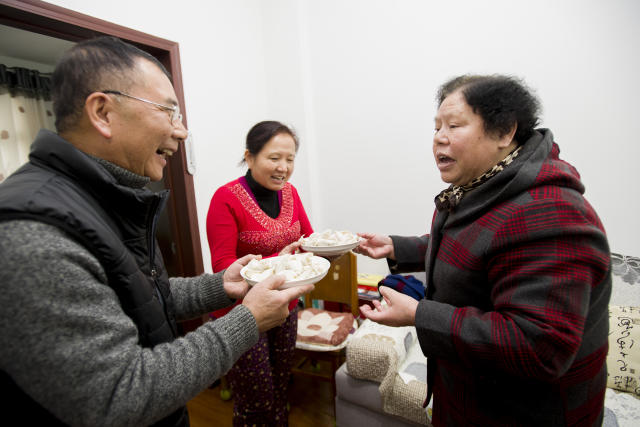 余洪芝(右)在冬至为邻居送上饺子 图片来源:新华社