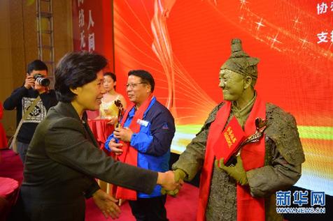 河北省委常委、宣传部部长田向利为感动人物颁发奖杯和证书。