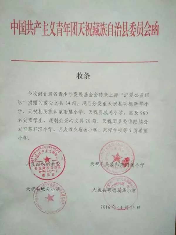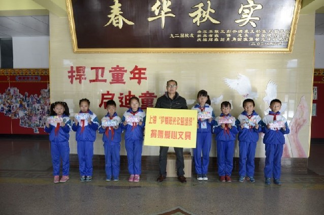 11月17日,上海心力行公益组织、支教中国2.0等组织和个人,又通过“沪爱阳光撑起陇原希望”活动,向武威市下辖的天祝县明德新华小学、天祝民族师范附小、天祝县城关小学,以及另外9所希望小学赠送30箱文具、数千套/件/只铅笔盒、水彩笔、书包、笔记本等学习用品,惠及共11所学校,4000名学生。
