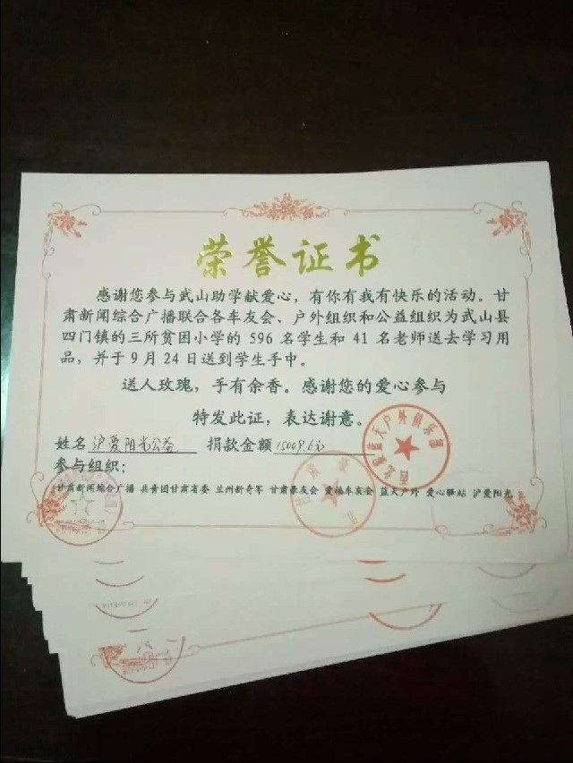 2016年9月,“沪爱阳光”公益组织共募集到10059.6元爱心款,参与到了FM96甘肃新闻综合广播发起的新学期助学活动。