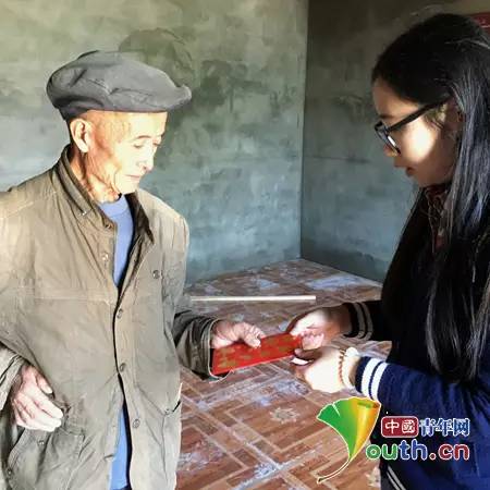 研支团成员施玲玲将爱心人士的善款转交给阿房的爷爷