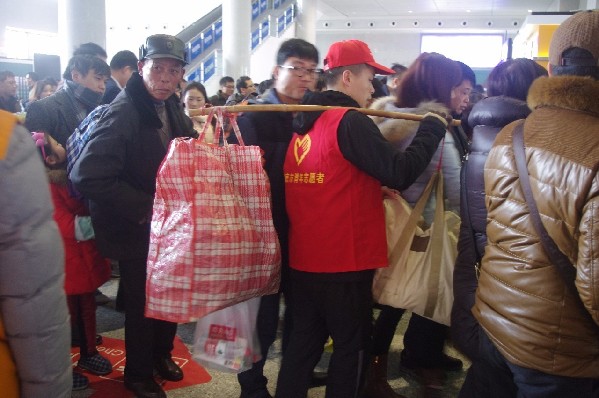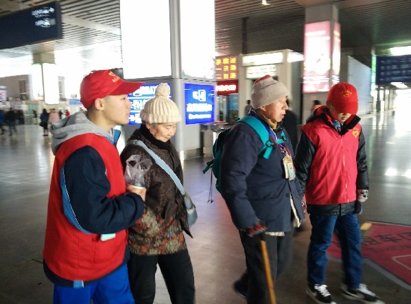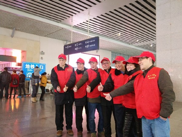 老人志愿队,平均年龄65,为旅客热情的提供志愿服务,发挥余热。