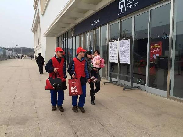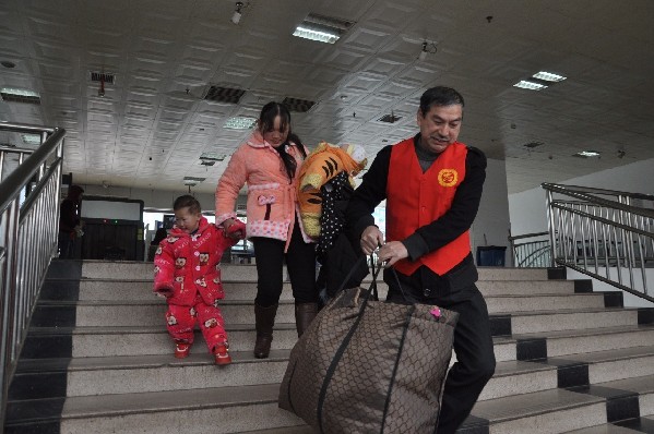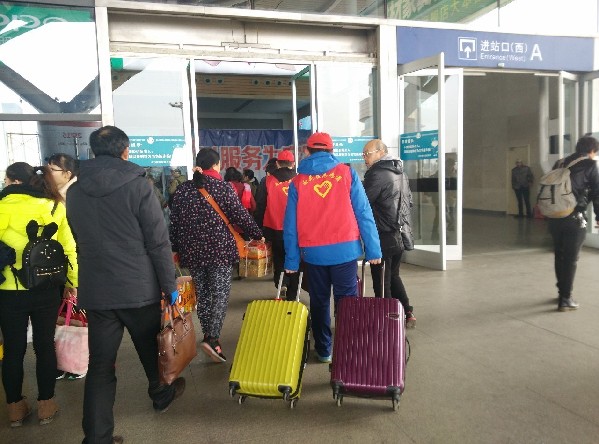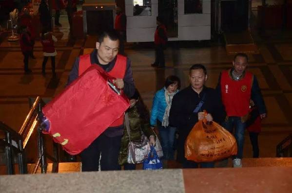 志愿者正在帮助几位老年人搬运行李,加快他们回家的步伐。