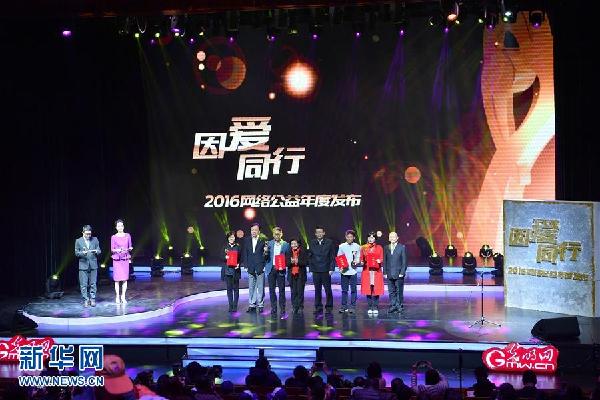 1月12日,嘉宾为获奖机构代表颁发“2016网络公益年度机构”奖。当日,由中央网信办指导、中国互联网发展基金会主办、光明网承办的“因爱同行”2016网络公益年度总结发布活动在北京举办。活动旨在梳理2016年网络公益事业发展成果,树立正面典型,凝聚社会共识,以激励全社会更好地参与网络公益。新华社记者李鑫 摄