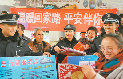 山西平遥车站派出所组织民警及辖区青年志愿者向游览古城的游客发放大红“福”字,并宣传安全出行知识。