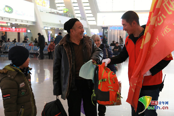 青年志愿者帮老年旅客提行李。团青海省委供图