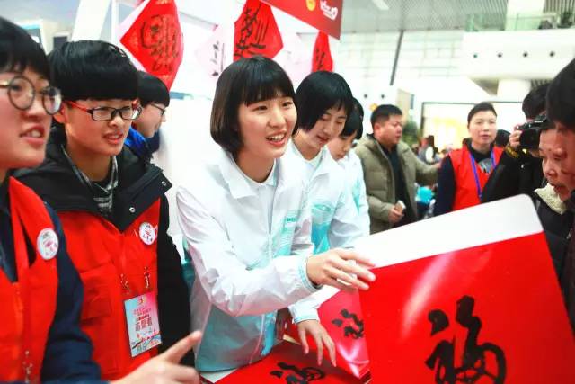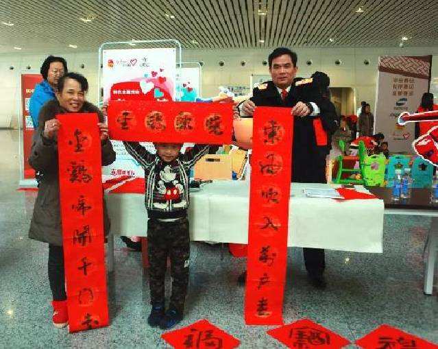 “快乐圆梦”主题活动区里,不时传来小朋友们的欢声笑语。在这里,志愿者亲切地在教返乡农民工子女画画,手工制作等,还为农民工子女送上围脖、手套、拍立得照片等小纪念品,为农民工子女的返乡之路带去了快乐。制作“梦想接力卡”,由外来务工子女填写,为其梦想助力启航。“在杭州忙着打工,也没时间带孩子出去玩,现在看到他们玩的这么开心真是太感谢你们了。”旁边等待的返乡旅客啧啧称赞,不时的为孩子的手工作品拍手叫好。“点亮祝福”主题活动区的现场创作“福”字、春联引得满堂喝彩,路人纷纷拿起手机录影分享、领取福字留念。