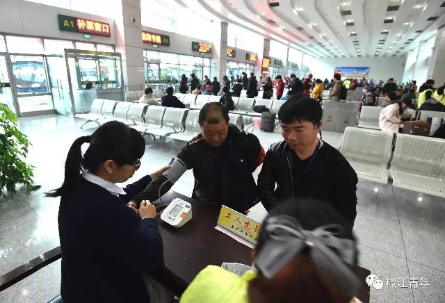 义诊服务台的志愿者都是来自台州中心医院、万康医院的医生护士,在为旅客测量血压的同时也提供健康咨询服务,这里还预备了应急药品,以备不时之需。