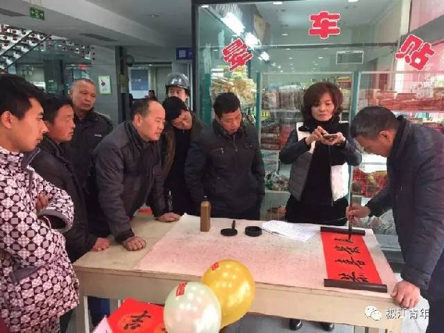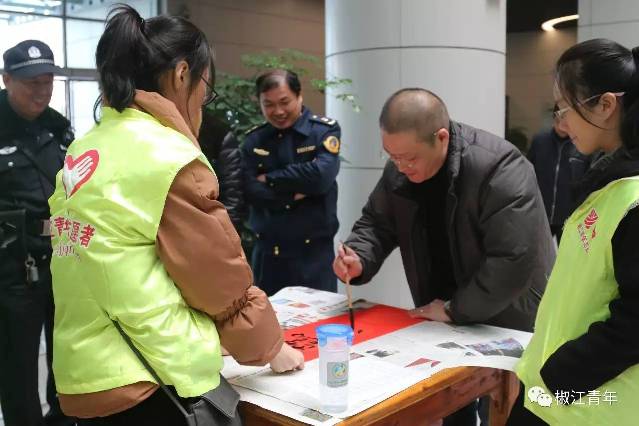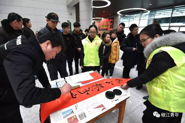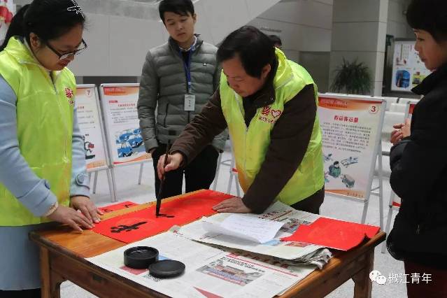椒江区青少年宫、椒江二中及椒江区交通局的志愿者现场挥毫,为旅客们书写春联。