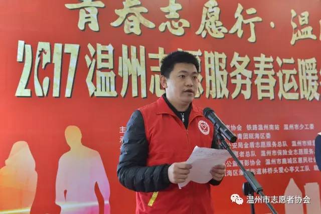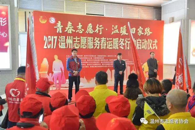 启动仪式上,主办单位为6支春运“暖冬行动”志愿服务队伍授旗,温州市绿意青年志愿者服务中心主任包邦胜代表温州千名春运“暖冬行动”志愿者发言。