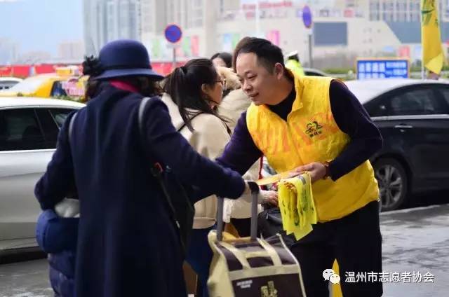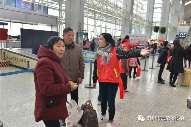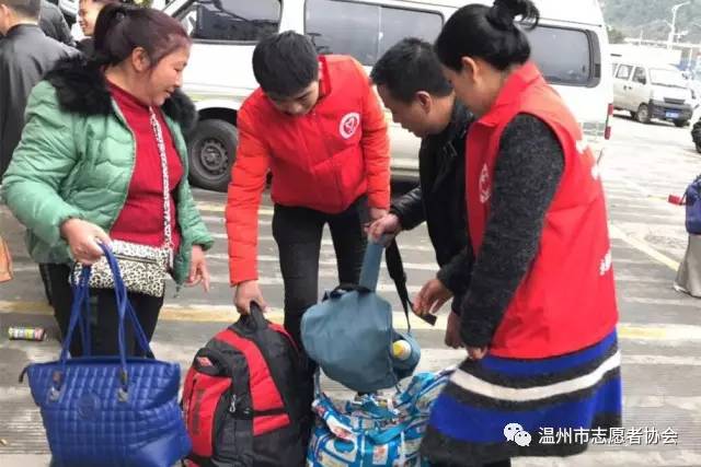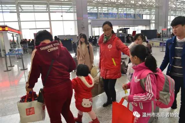 永嘉团县委、县志愿者协会组织志愿者在黄田动车站和温州北汽车站,为老人、孕妇等重点旅客提行李,帮助旅客完成购票、进站、上车、出站等引导帮扶工作,解答旅客咨询。
