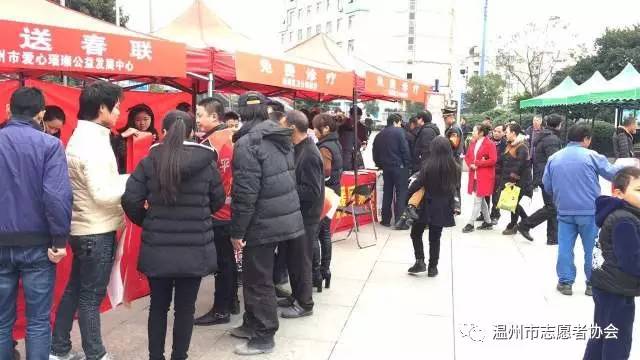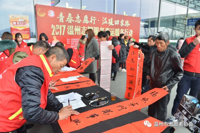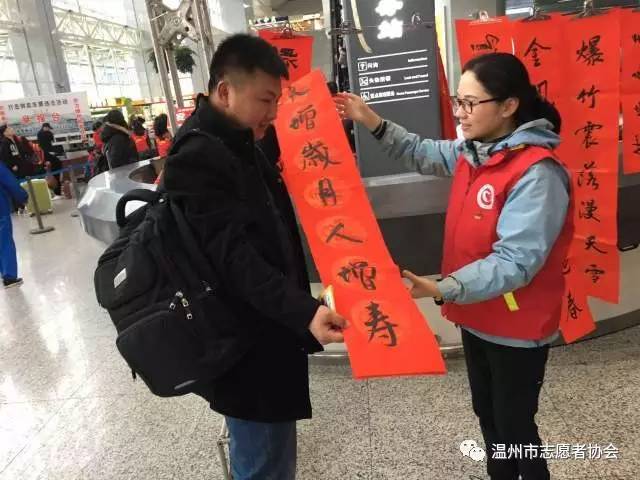 瓯海区吹台书画社的志愿者撰写春联赠送旅客