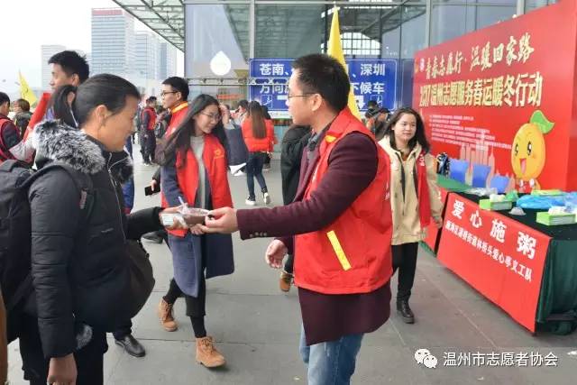 瓯海区潘桥街道林桥头爱心亭义工为旅客提供爱心粥和姜茶