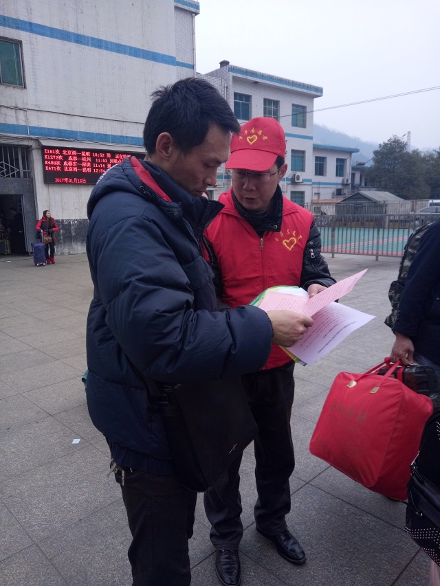 志愿者们手拿水壶、宣传单、小喇叭,深入车站广场、站台、候车室、售票厅协助维护站车秩序,为旅客讲解乘车途中如何防盗、防骗,如何识别真假车票,并为候车旅客发放了《春运出行安全指南》、《乘车时遗忘或丢了身份证、车票怎么办?》、《购票乘车要凭证,身份车票要相符》以及知路、爱路、护路等宣传材料。