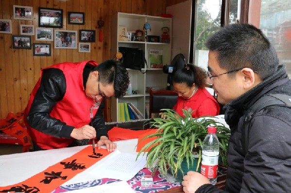 1月17日,省志愿服务联合会、省志愿者行动指导中心、省青年志愿服务基金会组织文艺志愿者,前往2017年“志愿暖春”春运志愿服务点甲秀楼“微笑小屋”为广大游客、市民免费书写赠送春联,让市民们暖心更开心。