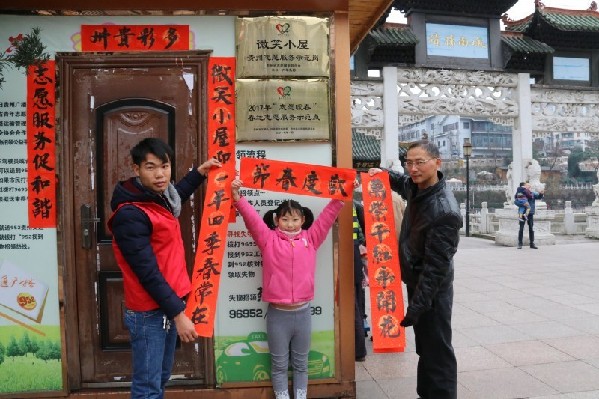 省志愿服务联合会副秘书长邓守成介绍,今年春运,我省共设立了志愿服务(站)点310个,在“志愿暖春”春运志愿服务点开展免费赠送春联活动,主要是丰富春运志愿服务的内容,更是让游客、市民带着志愿者的新春祝福回家。
