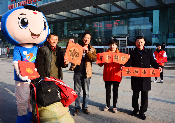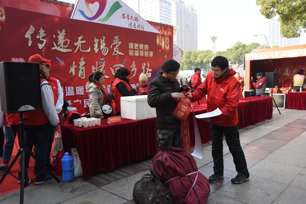 为大力弘扬雷锋精神,推动关爱他人、关爱社会、关爱自然志愿服务活动深入扎实开展,在全社会营造关爱、尊重、帮扶农民工的良好氛围,1月13日,伴随着2017年春运拉开帷幕,无锡市“传递无锡爱情暖回乡路”关爱农民工志愿服务活动也正式启动。活动由市委宣传部、市文明办、团市委主办,市志愿者总会秘书处等单位承办,得到了九色公益、二泉网络、优恩等志愿服务团队的积极响应和上海铁路局无锡站、无锡就业服务中心、无锡体彩中心、无锡移动分公司等单位的大力支持,社会爱心企业也纷纷加入,为活动增添了一份温暖。在随后的春运40天时间里,志愿者们将排班驻守在火车站南广场客流聚集地,为返乡农民工提供以“春风行动解民忧、应急救援保平安、文明巡访促和谐、热水姜茶献温暖、春联喜帖送祝福、网络购票享便利”为主要内容的六大志愿服务。此外,活动现场,志愿者们还为返乡农民工提供亲情电话拨打、新春留影、新语心愿、志愿益起来等志愿服务,通过无锡志愿者的亲情关爱和热心服务,让农民工兄弟的返乡之旅一路平安、舒心温暖。