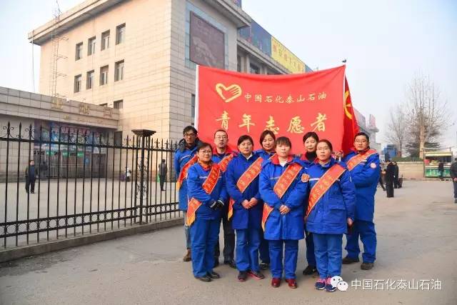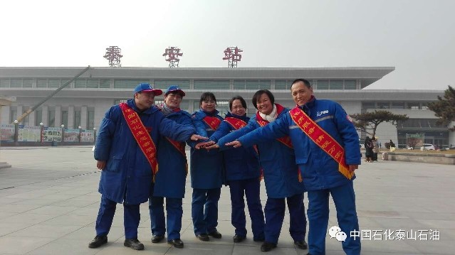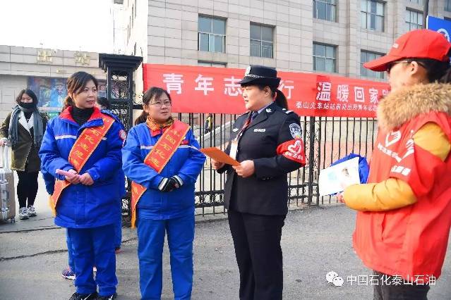 在泰山火车站,印有“中国石化泰山石油青年志愿者”和“中国共产主义青年团”的鲜艳旗帜迎风飘扬,中国石化青年志愿者们身穿工装,肩披“青年志愿者服务队”、“优质服务情暖万家”绶带,大家精神抖擞、排列整齐地站在出站口,等待出站的人流。